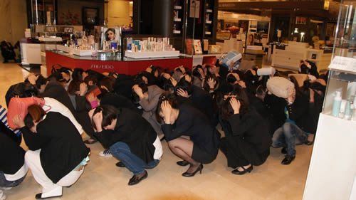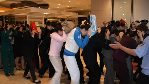 國芳百貨員工按照防震緊急避險的標(biāo)準(zhǔn)動作進(jìn)行演習(xí)