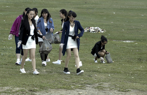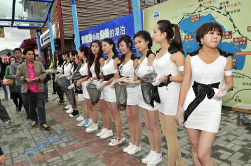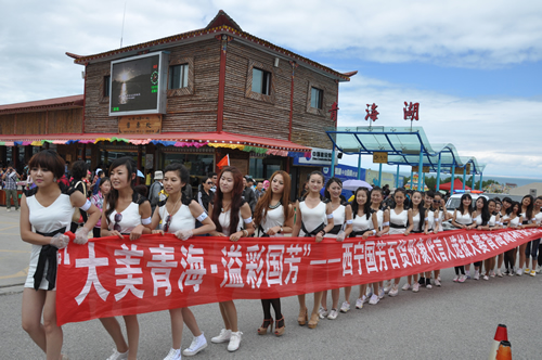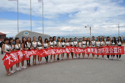 中午,一行到達青海湖畔。天高地闊的美景與靚麗的美女即刻構筑成為一道精彩的風景,隨行攝影師、攝像師即刻拿起機器留下許多難得的好畫面。接下來的環保實踐與環保意識推廣為眾多選手留下了深刻的印象,許多選手紛紛表示希望通過自己的行動提高社會環保意識,讓跟多人參與到保護青海湖環境中來。