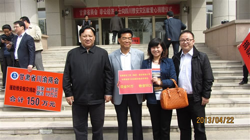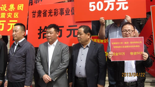 2013年4月22日下午15時(shí),在甘肅省政協(xié)一樓,由甘肅省委常委、省委統(tǒng)戰(zhàn)部部長澤巴足,省委統(tǒng)戰(zhàn)部副部長、甘肅省工商聯(lián)黨組書記、第一副主席吳繼德等相關(guān)領(lǐng)導(dǎo)出席了“甘肅省商會(huì)非公經(jīng)濟(jì)人士向四川雅安災(zāi)區(qū)獻(xiàn)愛心捐贈(zèng)儀式”。捐贈(zèng)現(xiàn)場眾多甘肅省非公企業(yè)向4月20日雅安市地震災(zāi)區(qū)進(jìn)行了捐贈(zèng),廣大愛心企業(yè)和人士用自己的實(shí)際行動(dòng)對災(zāi)區(qū)同胞奉獻(xiàn)了自己的真情和祝福。