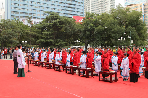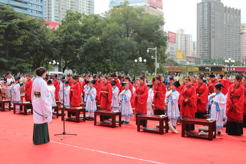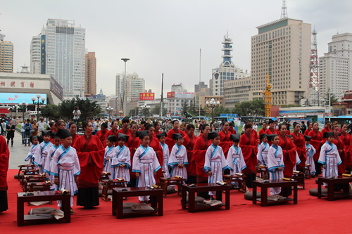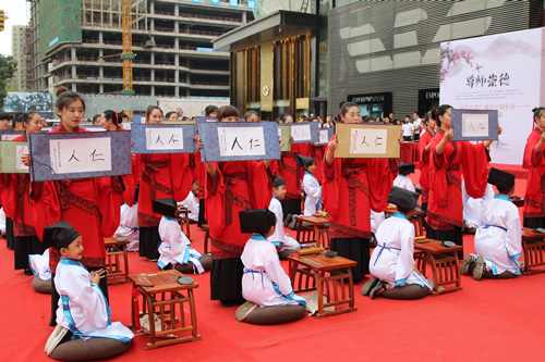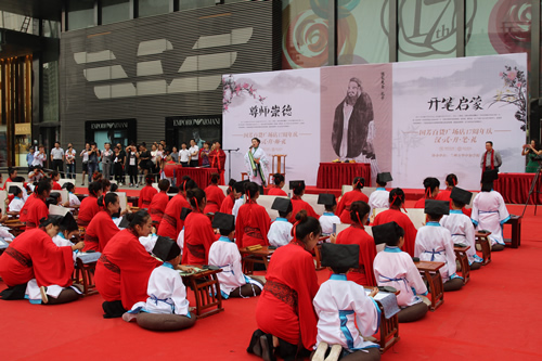 傳承中國文化,啟發學子奮發向上,再現古典禮儀之莊重恢弘。9月10日,國芳集團在東方紅廣場舉行大型漢式拜師禮開筆禮儀式。本次活動共招募40名6-9歲的學子參加。拜孔子、點朱砂、擊鼓明志,引眾多市民觀禮。