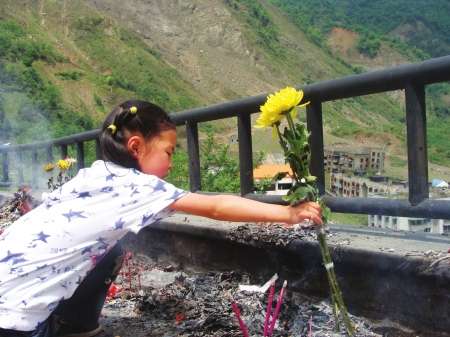 小女孩名叫戎小雨,地震發生時,她的媽媽戎鳳菊被埋在王家巖廢墟下。昨天一早,在外婆、小姨、爸爸帶領下,小雨回到了老縣城遺址,祭奠媽媽。