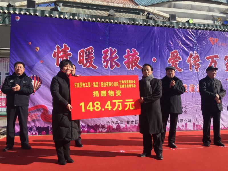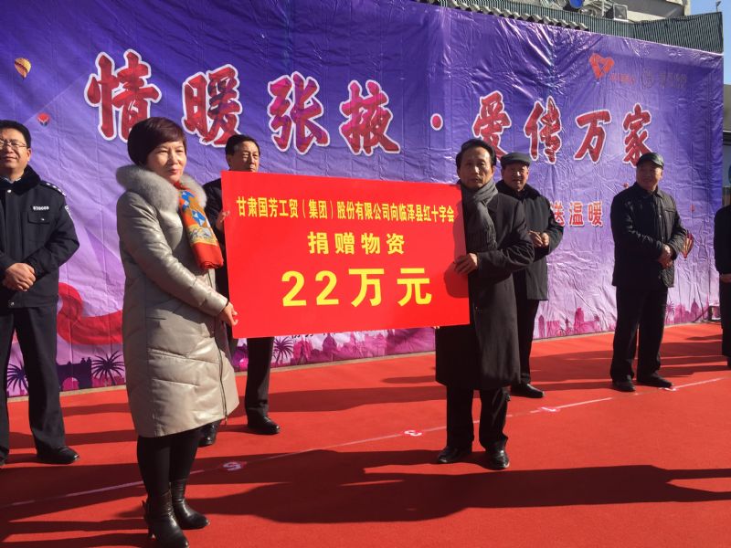 2019年1月11日,甘肅省慈善總會、張掖市慈善協會、甘州區慈善協會以及臨澤縣紅十字會攜甘肅國芳工貿(集團)股份有限公司在張掖市中心廣場共同舉行“情暖張掖·愛傳萬家”送健康送溫暖活動,將2000套棉衣,2000余套秋衣秋褲,27臺彩電以及300余件小家電合計價值148萬元的過冬物資帶給山丹縣,民樂縣的困難群眾,將2500個醫藥箱帶給臨澤縣的老人們。此次活動傳導社會幫扶、精準扶貧精神的同時也默默為社會傳導著一份正能量。