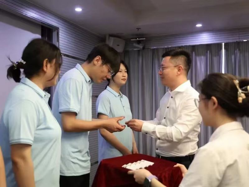 伴隨著激昂的音樂,入職儀式進入了發放工牌的環節。國芳集團各位領導面帶微笑,將蘊含著公司信任與期望的工牌并伴手禮交到新員工手上,工牌在燈光的照耀下,折射出他們堅定的信念和對新征程的信心。
